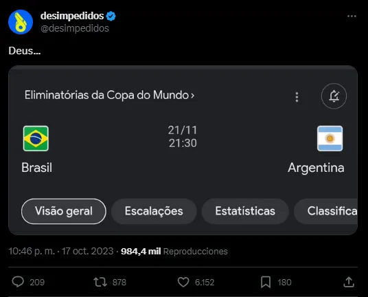 Sin embargo, con el antecedente previo de la suspensión, y los contextos que ambos equipos atraviesan, en las redes sociales, los hinchas de la selección brasileña pidieron que nuevamente se suspenda el clásico. A modo de broma en un posteo viral de una reconocida cuenta de Twitter oriunda de Brasil, los torcedores del Scratch no quieren enfrentar a Argentina por el enorme momento que lleva la Scaloneta contra la irregularidad del seleccionado brasileño este 2023.