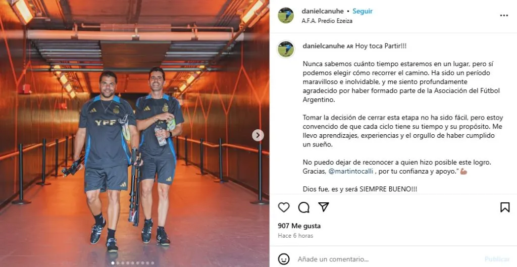 Es que Daniel Canuhe publicó un comunicado para anunciar su despedida de la Selección Argentina. El entrenador de arqueros, que trabajaba bajo las órdenes de Martín Tocalli, lo anunció a través de un posteo de Instagram.