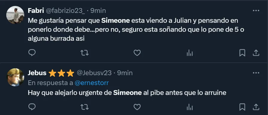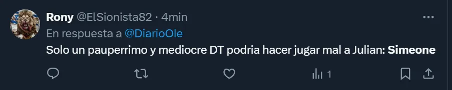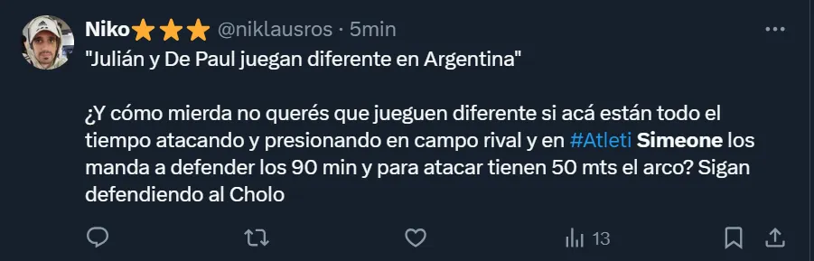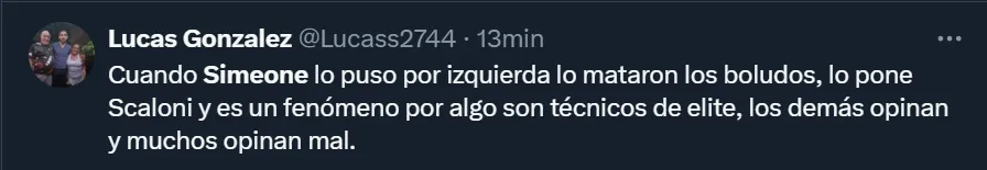 “Hay que alejarlo urgente de Simeone al pibe antes que lo arruine”, fue uno de los tantos comentarios que lanzaron los hinchas de la Selección Argentina para cuestionar al entrenador rojiblanco por la actuación que tuvo el oriundo de Calchín en la goleada contra Bolivia. De todas formas, hubo quienes también entendieron que jugó en la misma posición que lo hace en su club, y le dieron la derecha al ex mediocampista.