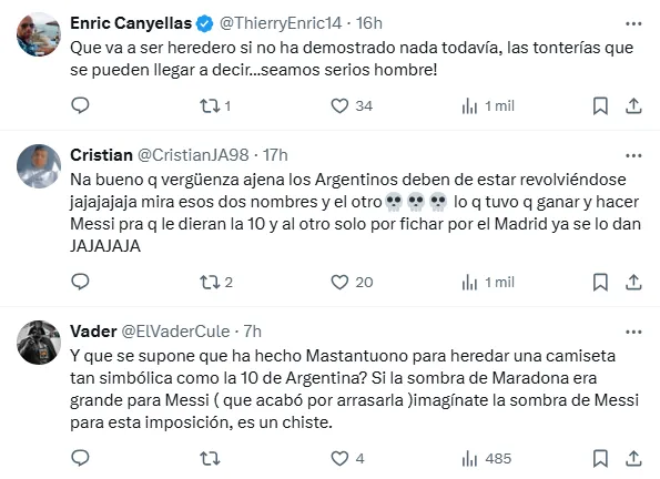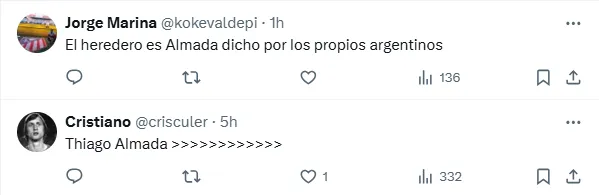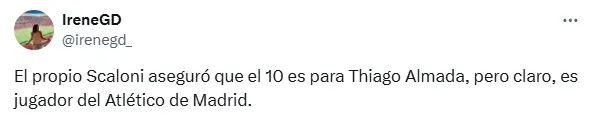 A todo esto, desde el sector del Atlético de Madrid mostraron toda su indignación en redes sociales. ”El propio Scaloni aseguró que el 10 es para Thiago Almada, pero claro, es jugador del Atlético de Madrid”, ”Ya han dicho q el 10 lo llevará Almada, pero como os manda quien os manda y hay q comer las lentejas pues decís lo q os interesa” y ”Que va a ser heredero si no ha demostrado nada todavía, las tonterías que se pueden llegar a decir…seamos serios hombre!”, son solo algunos de los tantos comentarios de los colchoneros que andan desparramos en Twitter respecto al tema.