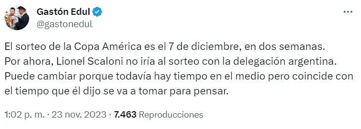 “El sorteo de la Copa América es el 7 de diciembre, en dos semanas. Por ahora, Lionel Scaloni no iría al sorteo con la delegación argentina. Puede cambiar porque todavía hay tiempo en el medio pero coincide con el tiempo que él dijo se va a tomar para pensar”, profundizó el periodista en su cuenta de Twitter.