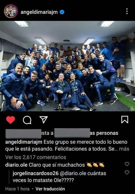 En más de una ocasión, Cardoso salió al cruce para defender a Di María, y ahora que llegaron los halagos, aprovechó su cuenta de Instagram para responder en el posteo que hizo el extremo de Benfica. Tras publicar una foto en el vestuario junto a toda la delegación, su esposa reaccionó al comentario del CM de Diario Olé.