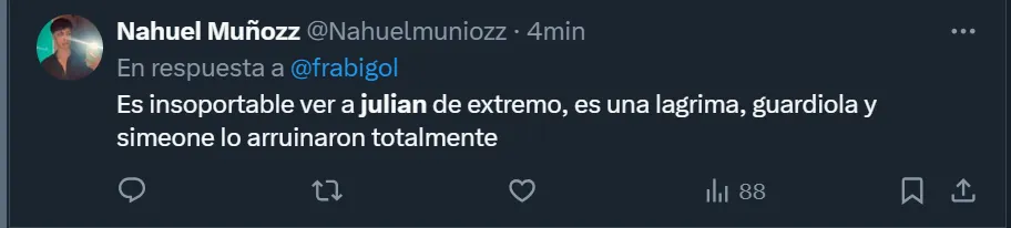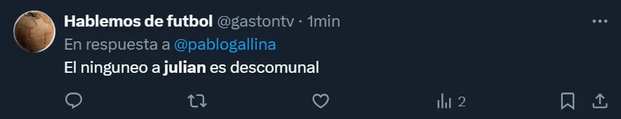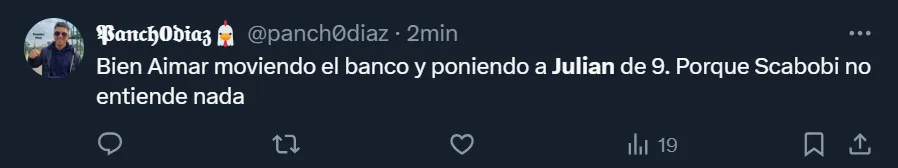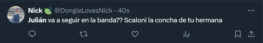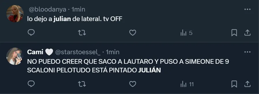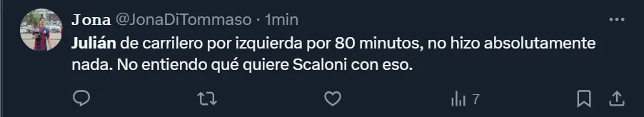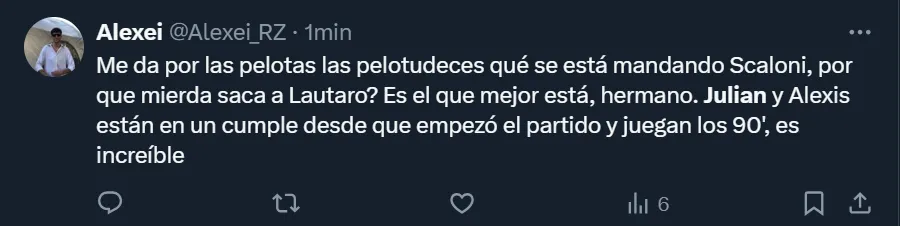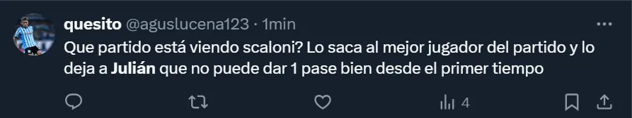 En X, ex Twitter, el DT se transformó en tendencia a nivel nacional debido a la gran cantidad de críticas que recibió. Así como hubo cuestionamientos por la función del oriundo de Calchín, también arremetieron contra Scaloni por haber dejado al ex River durante todo el partido y que Lautaro Martínez fuera reemplazado luego de convertir el tanto de la victoria.