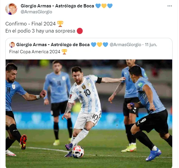 Con una foto del encuentro entre Argentina y Uruguay en el 2021, Armas posteó: “Confirmo – Final 2024” junto a un emoji de una copa. Y además, destacó que habrá una sorpresa: “En el podio 3 hay una sorpresa”. ¿Podrá el equipo de Scaloni quedarse con el bicampeonato?