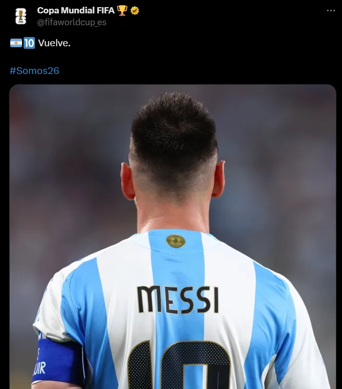 Junto con una foto de Leo con la 10 albiceleste, y una campaña por el Mundial (#Somos26), el perfil de FIFA expresó: “Vuelve“. El posteo en cuestión se llenó rápidamente de comentarios y de likes, todo para celebrar el regreso del campeón del mundo y bicampeón de América al combinado dirigido por Lionel Scaloni.