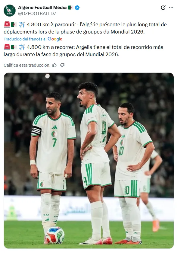 Pero el que sí se quejó, por el resultado que le dejó el diagrama de la FIFA, fue Argelia, porque se enteró que será uno de los dos participantes que mayor recorrido hará con sus tres compromisos correspondientes a la Fase de Grupos de la Copa Mundial 2026. Lo dicho, primero con Argentina y luego vs. Jordania y el cierre con Austria.