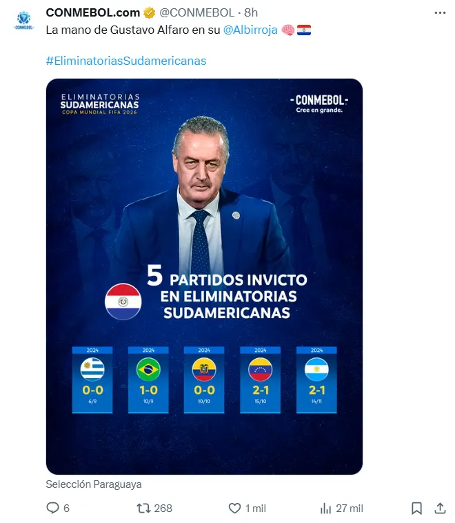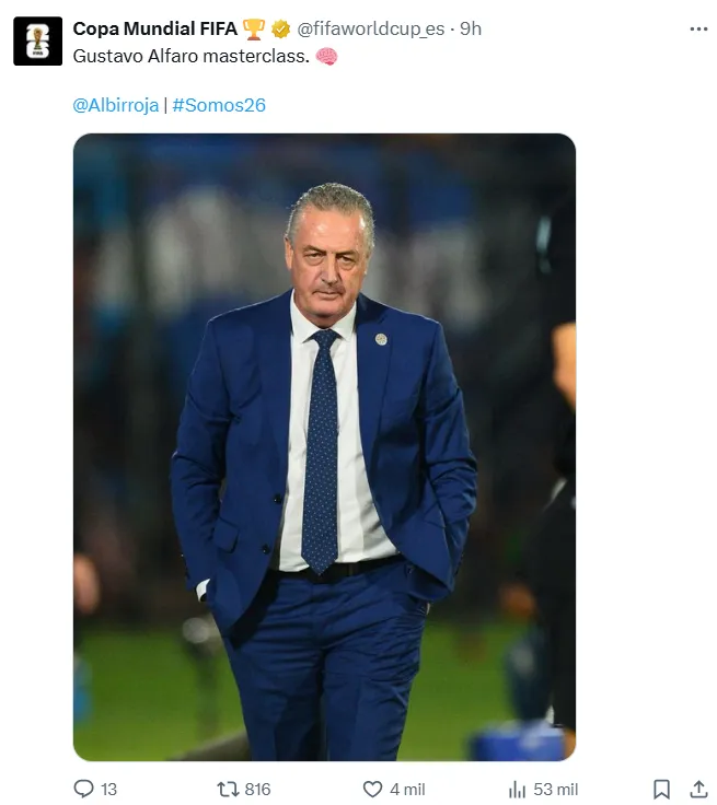 Gustavo Alfaro masterclass“, publicó la cuenta oficial de la Copa del Mundo, dejando en claro que la influencia del director técnico fue clave para este momento del equipo. En la misma sintonía, la cuenta oficial de CONMEBOL mostró los números del estratega en Paraguay, donde todavía no conoce la derrota.