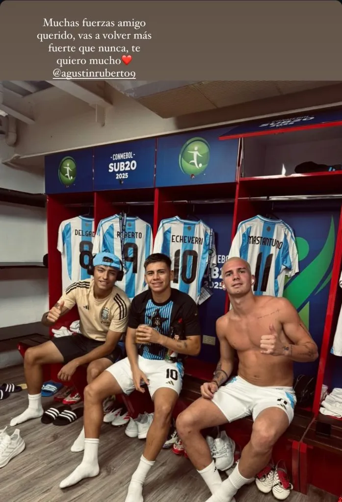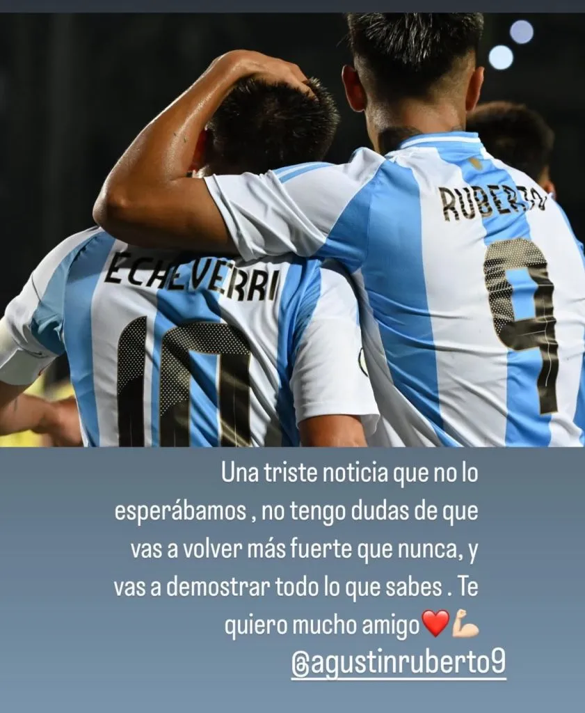 “Una triste noticia que no esperábamos. No tengo dudas de que vas a volver más fuerte que nunca y vas a demostrar todo lo que sabés. Te quiero mucho, amigo”, escribió Echeverri en una historia que compartió desde su cuenta de Instagram. “Muchas fuerzas amigo querido. Vas a volver más fuerte que nunca. Te quiero mucho”, le expresó Mastantuono por la misma vía.