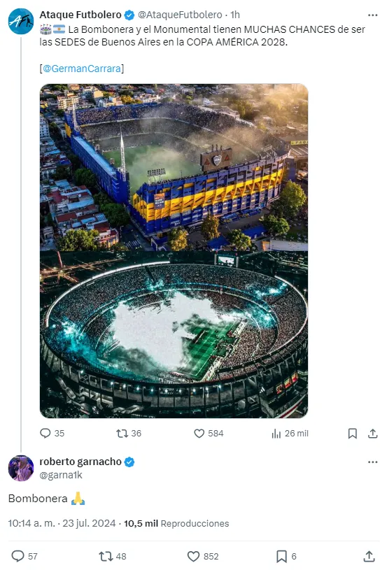 Roberto Garnacho respondió un posteo en X (Twitter) vinculado a las dos canchas y pidió: “Bombonera”. El hermano del futbolista del Manchester United quiere volver al Alberto J. Armando, pero con su hermano como protagonista en la Selección para defender el título.