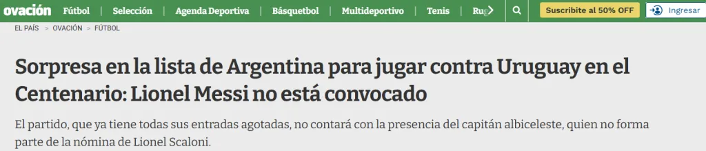 Por otro lado, Ovación de Uruguay, resaltó: ”Sorpresa en la lista de Argentina para jugar contra Uruguay en el Centenario: Lionel Messi no está convocado. El partido, que ya tiene todas sus entradas agotadas, no contará con la presencia del capitán albiceleste, quien no forma parte de la nómina de Lionel Scaloni”.