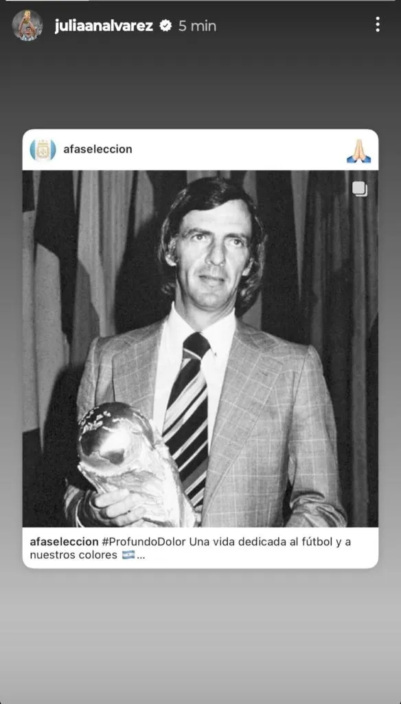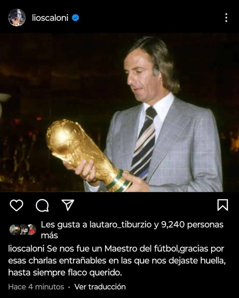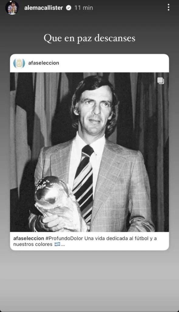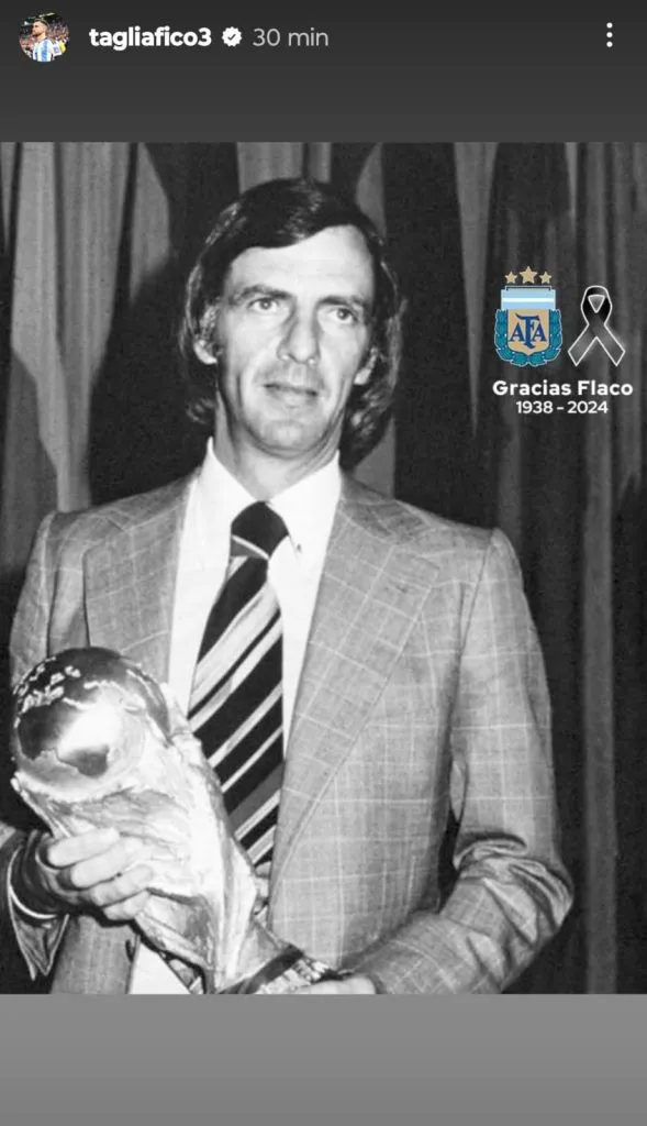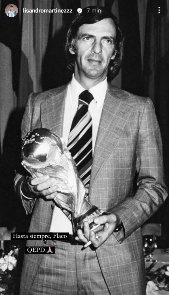 Dentro de los campeones de Qatar 2022, entre otros, publicaron mensajes Enzo Fernández y Lisandro Martínez, quienes subieron historias en su cuenta de Instagram con imágenes de Menotti, acompañadas de un pequeño texto. “Hasta siempre, Flaco. QEPD”, escribió Licha. También, posteó el entrenador, Lionel Scaloni, quien le agradeció por las charlas que compartieron.