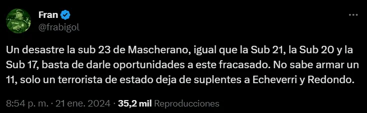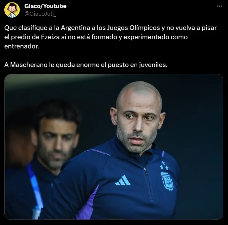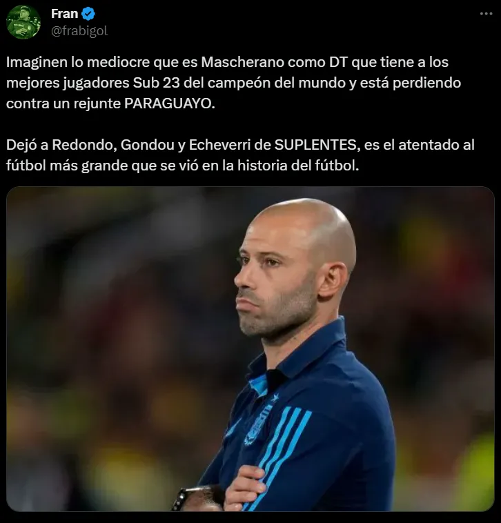Inclusive, por intermedio de las redes sociales, los hinchas argentinos no se guardaron absolutamente nada. Por el contrario, durante prácticamente todo el compromiso cargaron contra el propio Javier Mascherano. Es que el Jefecito viene siendo cuestionado desde los fracasos que diagramó anteriormente con la Albiceleste Sub-20.