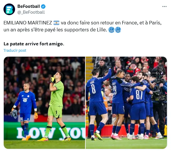 Asimismo, el marplatense logró unir a la afición del Lille con la del conjunto de la capital, puesto que hay hinchas que ven una especie de revancha en una eliminación del Aston Villa por lo comentado anteriormente que sucedió por Conference. ”Contamos con ustedes parisinos, para que le den una buena bienvenida”, apuntó un simpatizante de; LOSC.