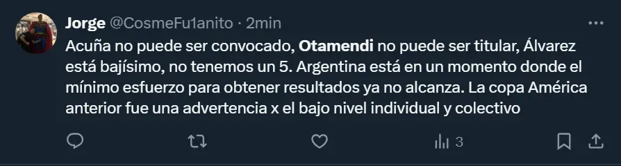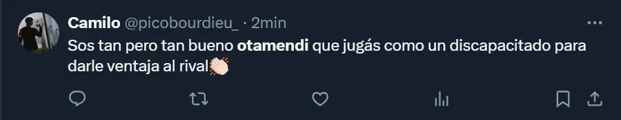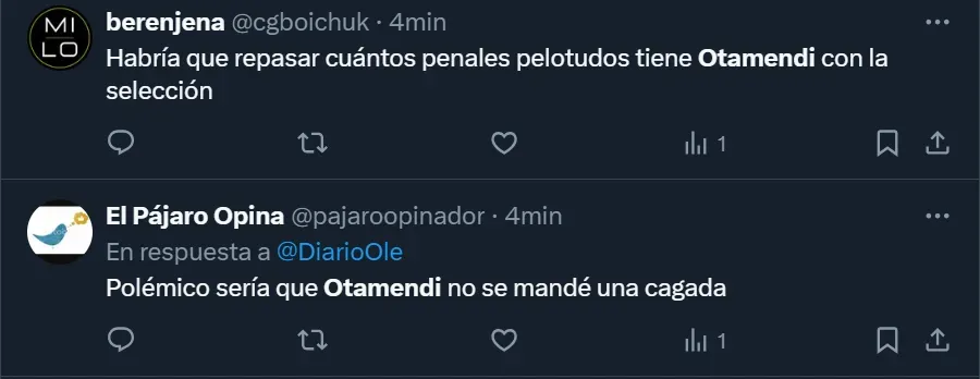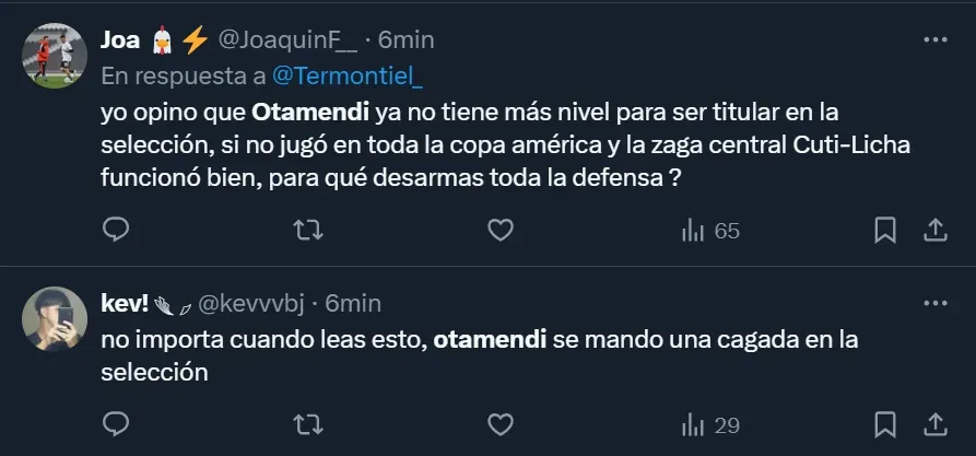 “Basta de demagogia, muchachos. Es un penal clarísimo. Tenemos un caballo jugando de central que no debería volver a ser convocado. Debería estar cobrando jubilación en este momento. Otamendi, te tendrías que haber ido con Di María, basura”, escribió el usuario de X (ex Twitter) @arrontacarp, quien no fue el único que se desquitó con el futbolista de 36 años. Incluso, fueron varios los que solicitaron que el surgido de las inferiores de Vélez Sarsfield abandone al seleccionado.