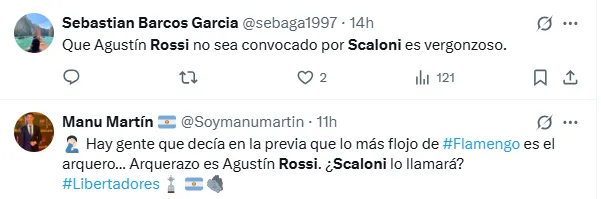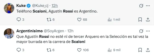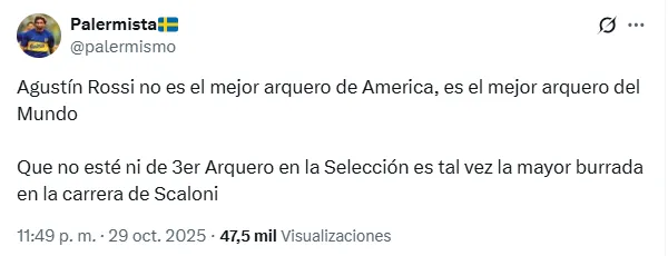 ”Agustín Rossi no es el mejor arquero de America, es el mejor arquero del Mundo. Que no esté ni de 3er Arquero en la Selección es tal vez la mayor burrada en la carrera de Scaloni”, escribió uno de los usuarios de X, durante el encuentro que se disputó en el Cilindro de Avellaneda.