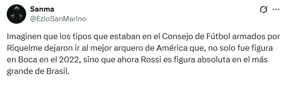 De paso, también hubo espacio para las críticas a Juan Román Riquelme, quien dejó ir a Rossi en 2022. ”Imaginen que los tipos que estaban en el Consejo de Fútbol armados por Riquelme dejaron ir al mejor arquero de América que, no solo fue figura en Boca en el 2022, sino que ahora Rossi es figura absoluta en el más grande de Brasil”, opinó otro de los hinchas.