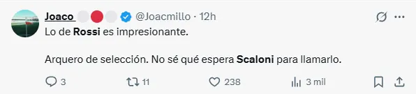 ”Agustin Rossi el mejor arquero de América, por lejos. Sea serio Scaloni este tipo tiene que estar en el mundial sí o sí”.