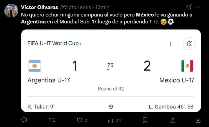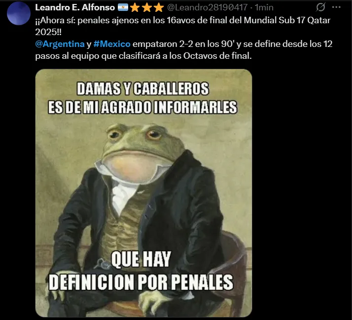 Por los 16avos de final del Mundial de Qatar Sub 17, la Selección Argentina fue eliminada por su par de México a través de la tanda de penales, ya que a lo largo del tiempo reglamentario el partido terminó igualado por 2-2 tras los goles de Ramiro Tulián y Fernando Closter, que anotaron para la Albiceleste, mientras que Luis Gamboa anotó un doblete para los aztecas.