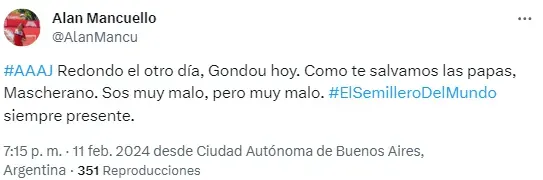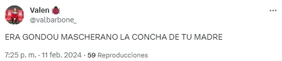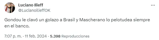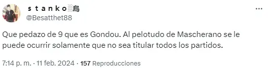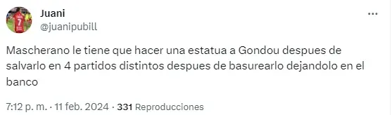 Otro disparó: “Gondou le clavó un golazo a Brasil y Mascherano lo pelotudea siempre en el banco“, mientras que otro de ellos fue por un camino parecido al opinar: “Mascherano le tiene que hacer una estatua a Gondou después de salvarlo en 4 partidos distintos después de basurearlo dejándolo en el banco“.