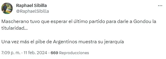 Es que el Jefecito optó, durante todo el torneo menos en esta última jornada, por dejarlo en el banco de suplentes para el arranque de los partidos. Hoy salió como titular y tapó bocas, anotando el gol de la clasificación. “Mascherano tiene que besar la foto de Gondou porque le salvó la carrera como DT“, lanzó un usuario en X.