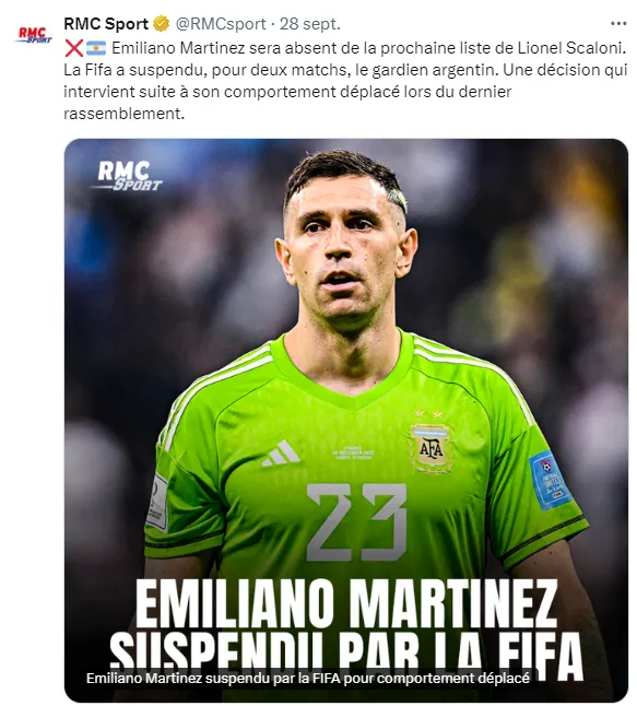 Tanto L’Equipe como RMC Sport, los dos medios más fuertes del país galo, le dedicaron sus páginas así como también publicaciones destacadas en redes sociales. ”Emiliano Martínez estará ausente en la próxima lista de Lionel Scaloni. La FIFA suspendió al portero argentino por dos partidos. Una decisión que surge tras su comportamiento inadecuado durante la última reunión”, destacó RMC.