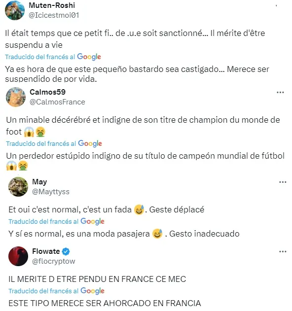 Como era de esperarse, las interacciones se reprodujeron rápidamente. La gran mayoría, celebrando la pena para el Dibu. ”Ya es hora de que este pequeño bastardo sea castigado… Merece ser suspendido de por vida” y ”Un perdedor estúpido indigno de su título de campeón mundial de fútbol” fueron algunos de los tantos comentarios que, palabras más palabras menos, se mantuvieron con el mismo tono.