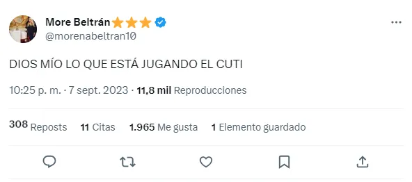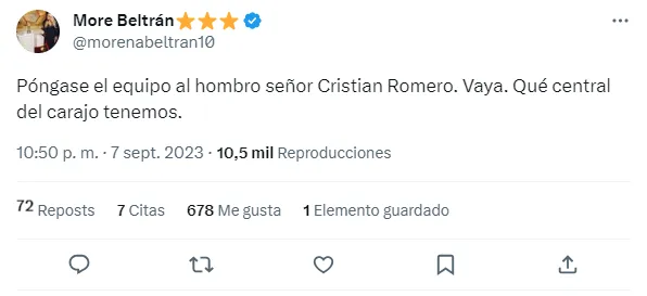 Durante el desarrollo de este encuentro, como se acostumbra a hacerlo, la reconocida periodista de ESPN, Morena Beltrán, analiza minuto a minuto el desarrollo del juego en las redes sociales, y en esta oportunidad, se deshizo en elogios para Cristian Romero, una de las figuras de la cancha.