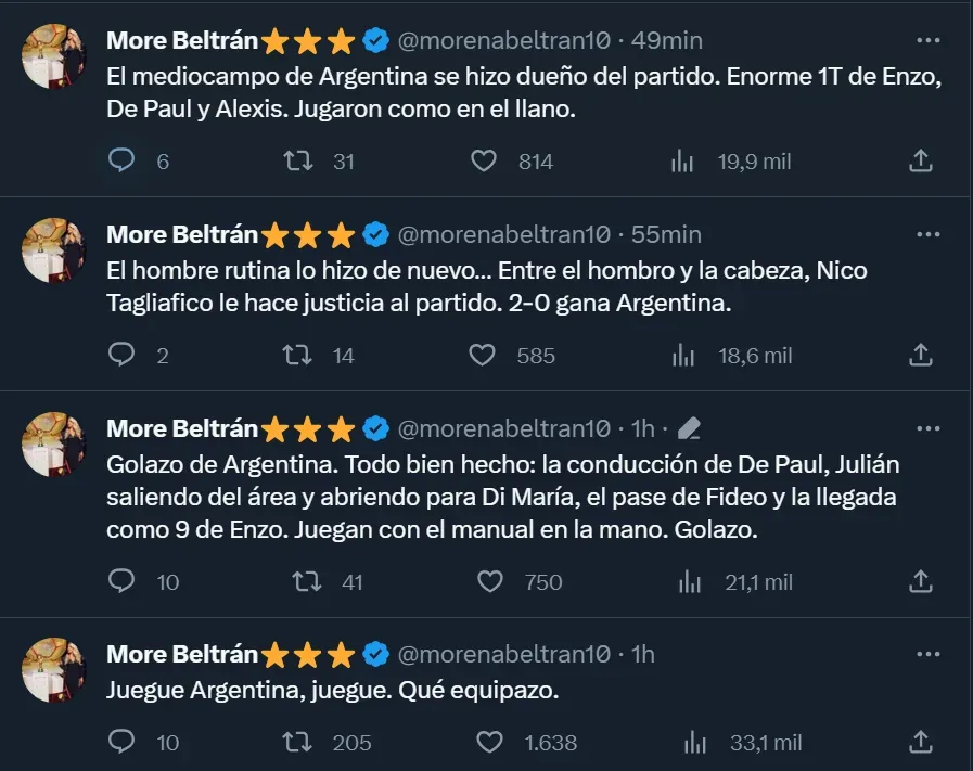 Por medio de su cuenta de Twitter, Beltrán hizo diferentes elogios: “Juegue Argentina, juegue. Qué equipazo”; “juegan con el manual en la mano” y “jugaron como en el llano”, fueron los comentarios más destacados de la nacida en Haedo, provincia de Buenos Aires. Y sí, la Scaloneta brilla como un diamante. ¡Deluxe!