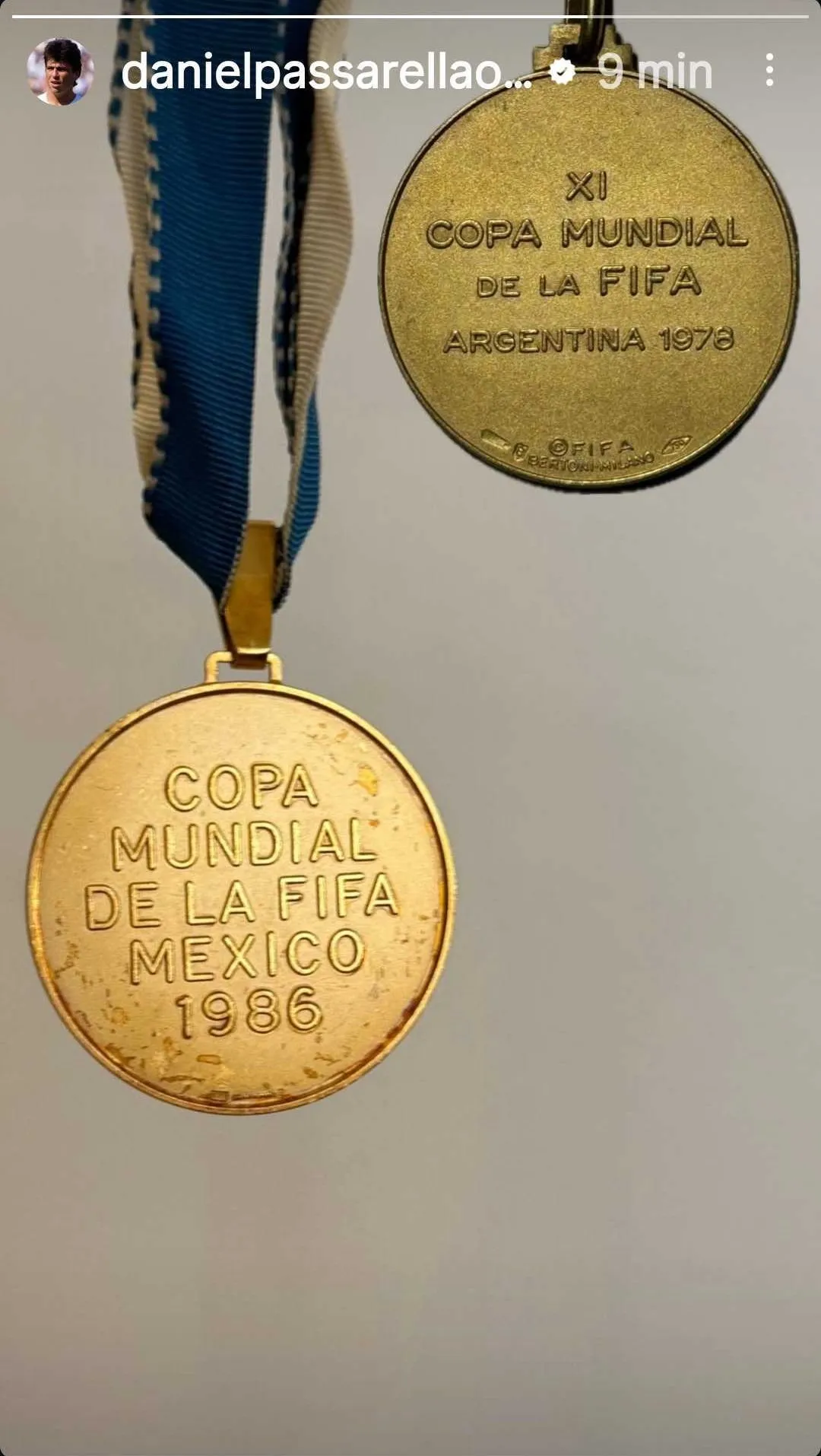 El exfutbolista de 72 años subió una historia en su cuenta oficial con la imagen de las dos medallas colgando, mostrando el dorso de las mismas, donde se ve el detalle del evento en el que las recibió. Historia pura del el fútbol argentino.