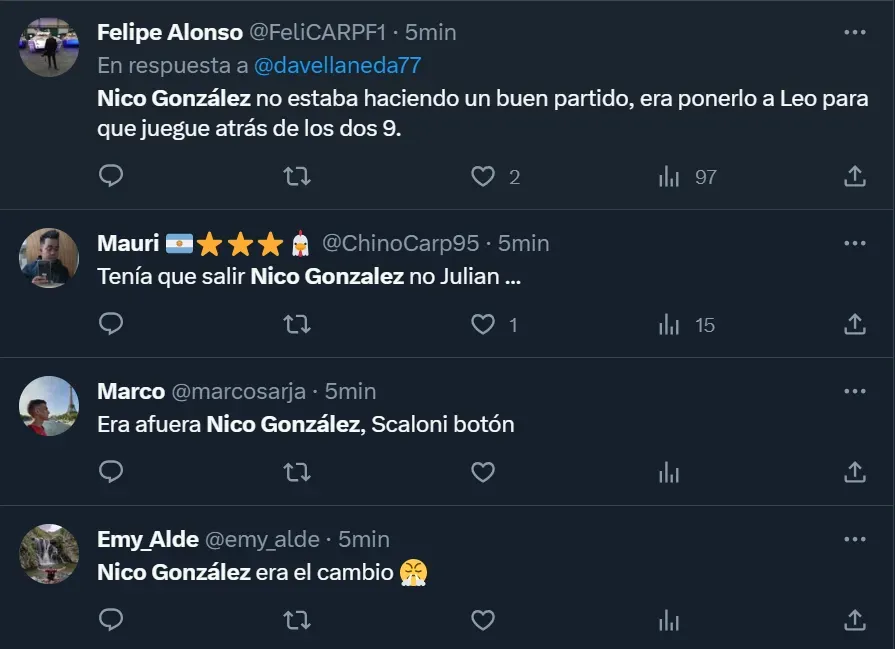 “Nico González no estaba haciendo un buen partido, era ponerlo a Leo para que juegue atrás de los dos 9”, escribió el usuario @FeliCARPF1 en la red social del pajarito. Mientras que también hubo varias opiniones pidiendo por la salida del ex Argentinos Juniors, algo que terminó ocurriendo cuando ingresó Lucas Ocampos, a los 48 minutos del complemento. ¿Coincidís con las críticas?