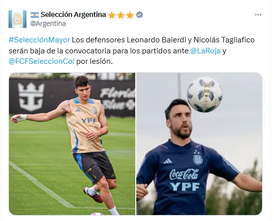 Para esta doble fecha, el seleccionador nacional no podrá contar con dos defensores: Nicolás Tagliafico y Leonardo Balerdi fueron desafectados de la convocatoria por lesión, por lo que serán sustituidos inmediatamente.