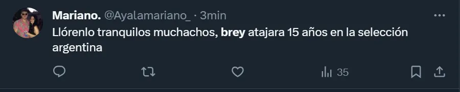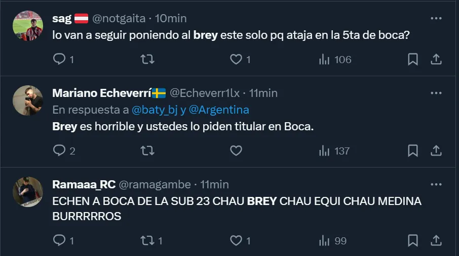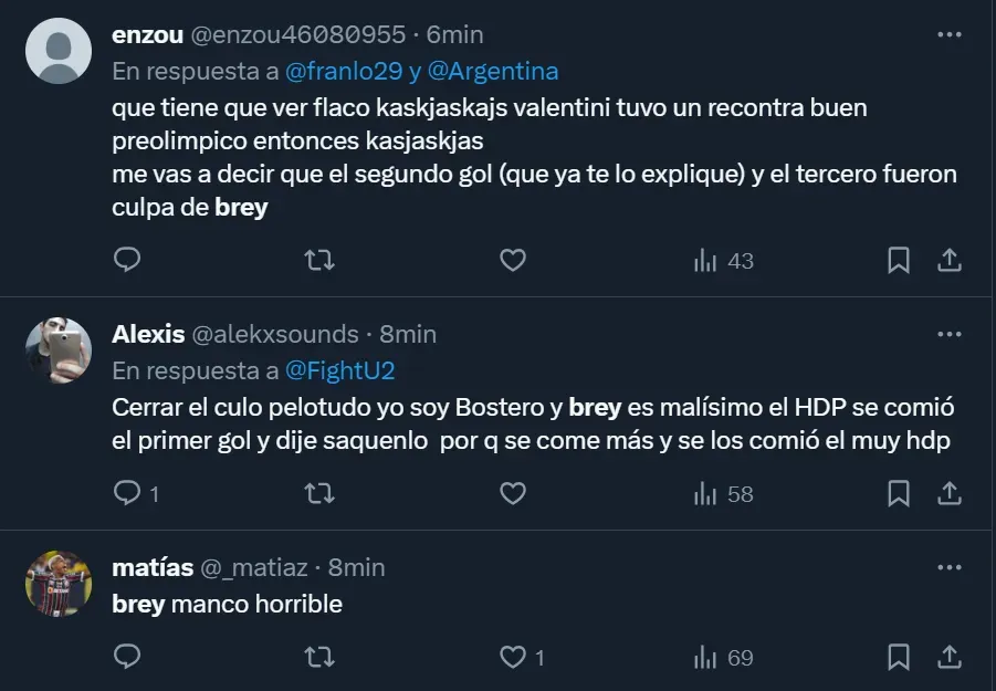 Los hinchas de la Selección Argentina, a través de las redes sociales, cuestionaron el rendimiento de los futbolistas por el desempeño que tuvieron, sobre todo, en el complemento. Y el que más críticas recibió fue Leandro Brey, el arquero de las inferiores de Boca.