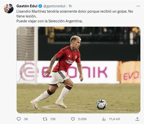 “Lisandro Martínez tendría solamente dolor porque recibió un golpe. No tiene lesión. Puede viajar con la Selección Argentina“, escribió el periodista Gastón Edul en sus redes sociales para llevarle la tranquilidad a los simpatizantes de la Albiceleste. Afortunadamente, falsa alarma.