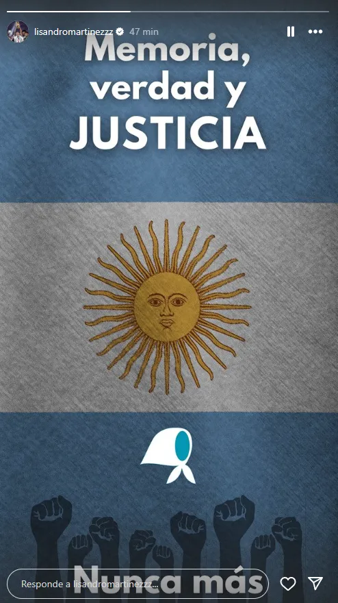 En un domingo 24 de marzo de grandes movilizaciones a lo largo y ancho del país, Lisandro Martínez aportó su mensaje mientras se encuentra en Inglaterra tras regresar de Estados Unidos por su desafectación en Selección Argentina durante la presente fecha FIFA.