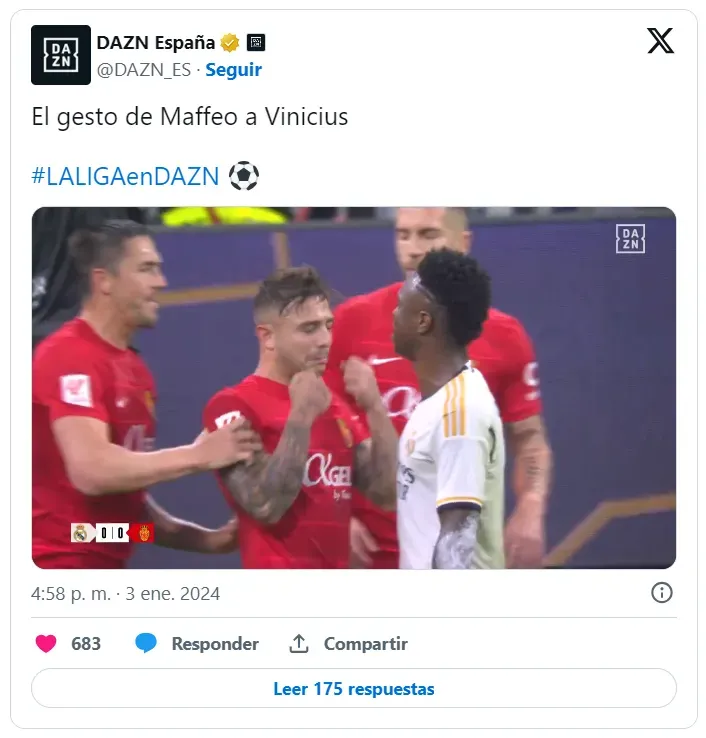 En un momento del partido Pablo Maffeo mantuvo una discusión con Vinícius Júnior. Intercambiaron palabras y el citado por Lionel Scaloni en noviembre, para las fechas 5 y 6 de las Eliminatorias Conmebol Sudamericanas, le hizo gestos al brasileño para tildarlo de llorón. Tal secuencia fue captada por las cámaras de DAZN que publicaron el material en sus cuentas de redes sociales.