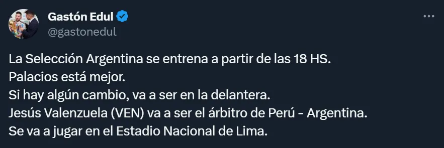 De cara a lo que será el partido en tierras peruanas, el cronista de TyC Sports aseguró que, en el caso de que haya modificaciones en el equipo, Scaloni los haría en el ataque. Y dado a que Julián Álvarez jugó que Lautaro Martínez, sería el delantero de Manchester City quien inicie.