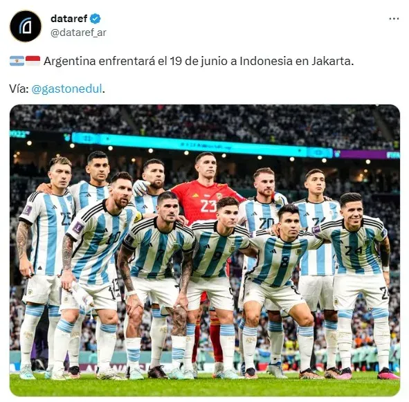 Es así que Edul ya pudo comunicar en TyC Sports el primer amistoso que jugará la Selección en la fecha FIFA que se avecina: será contra Indonesia, en su capital (Jakarta), el próximo 19 de junio. Además, se espera la confirmación del segundo encuentro de la gira, el cual podría ser contra Asia.