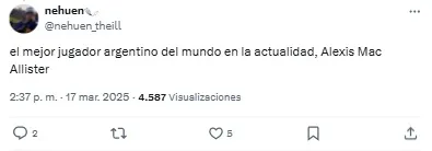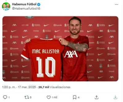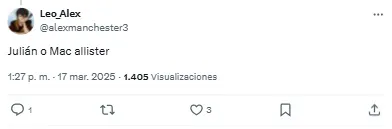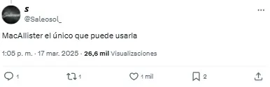 Entre los comentarios y quiénes asintieron con un ‘me gusta’, Alexis Mac Allister asomó como la opción más votada entre los hinchas de la Albiceleste. El volante ofensivo sabe lo que es utilizar la ’10’ en un club de la talla de Liverpool y podría utilizarla ante Uruguay y Brasil en estos encuentros.