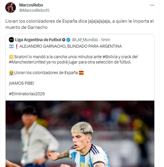 Tras confirmarse la noticia, en redes sociales hubo disgusto e indiferencia por parte de los españoles que, en su mayoría, se habían ilusionado en el pasado con la posibilidad de que Garnacho eligiera a La Furia Roja como seleccionado principal tras haber pasado por las categorías juveniles.