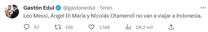Según informó el periodista Gastón Edul, Ángel Di María también será baja para el segundo encuentro. Fideo se tomará un merecido descanso luego de un año exigente y empezará a definir su futuro para la temporada 2023/24. ¿Habrá más ausentes?