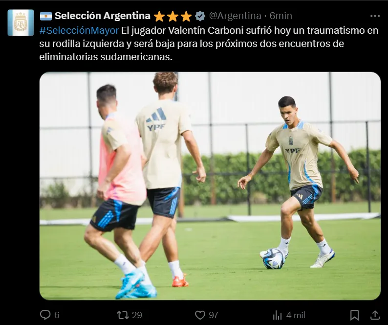 Una baja más para la Selección Argentina. En las horas previas a viajar desde Miami a Venezuela para el primer partido de Eliminatorias de la fecha FIFA de octubre, Valentín Carboni tuvo que ser desafectado debido a un traumatismo en su rodilla izquierda en el último entrenamiento antes de emprender vuelo rumbo a tierras venezolanas.