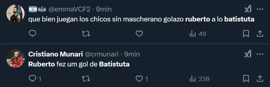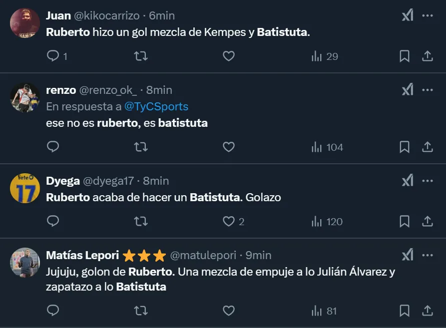 Automáticamente, muchísimos hinchas que estaban pendientes del encuentro entre argentinos y chilenos compararon el gol de Ruberto con los que anotaba Batistuta, quien aprovechaba su enorme potencia física para derribar a los rivales, como así también sus fortísimos remates, tanto de derecha como con la pierna izquierda, para ser un verdadero goleador.