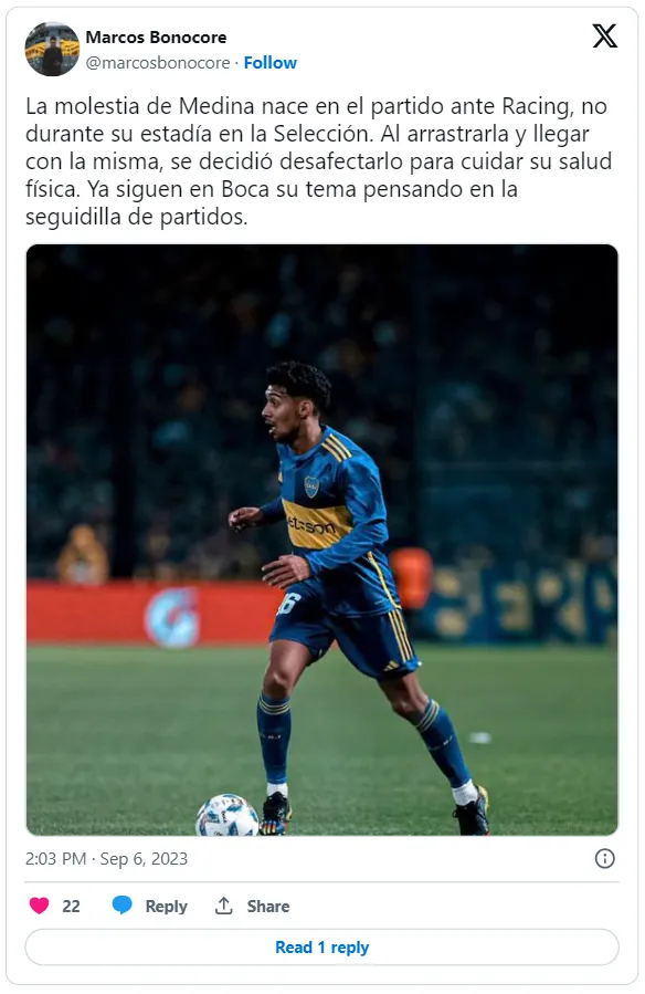 El jugador del Xeneize ya se presentó en Boca Predio para ser tratado por los médicos del club. De esta manera, continuará con su día a día en Ezeiza, pero nuevamente en el conjunto de la Ribera. El periodista Marcos Bonocore reveló que el problema físico lo arrastra desde la serie con Racing de Libertadores.