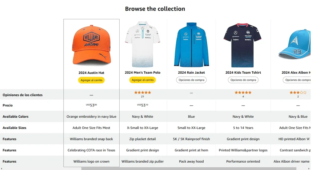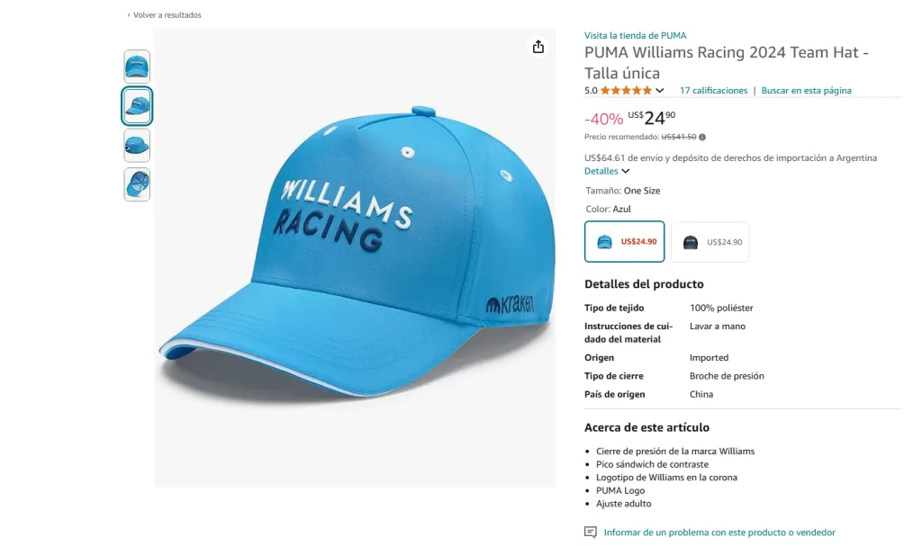 - Reseñas y valoraciones: Las reseñas de otros compradores te ayudan a tomar decisiones informadas. Verás lo que otros fans piensan sobre los productos de Williams Racing, lo que te permitirá elegir los mejores artículos según la calidad y el diseño.
