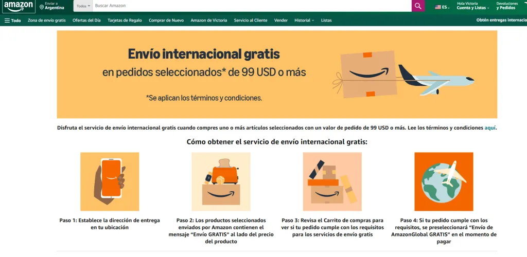 - El envío internacional gratuito está disponible para productos elegibles con un valor total de pedido de 99 dólares o más. No todos los artículos son elegibles para el envío internacional gratuito. Buscá “Envío gratuito” o “Tu pedido califica para el envío gratuito” durante todo el proceso de compra. Una vez que tengas un carrito con artículos elegibles y alcances o superes el umbral de la promoción, vas a ver la opción de envío gratuito en el momento de pagar.