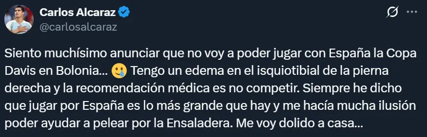 A través de sus redes sociales, el murciano compartió su dolor por tener que bajarse de la Copa Davis: “Siento muchísimo anunciar que no voy a poder jugar con España la Copa Davis en Bolonia… Tengo un edema en el isquiotibial de la pierna derecha y la recomendación médica es no competir. Siempre he dicho que jugar por España es lo más grande que hay y me hacía mucha ilusión poder ayudar a pelear por la Ensaladera. Me voy dolido a casa…”.