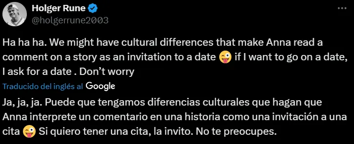 “Ja, ja, ja. Puede que tengamos diferencias culturales que hacen que Anna lea un comentario en una historia como una invitación a una cita. Si quiero ir a una cita, pido una cita. No te preocupes”, escribió el danés utilizando su cuenta personal en X.