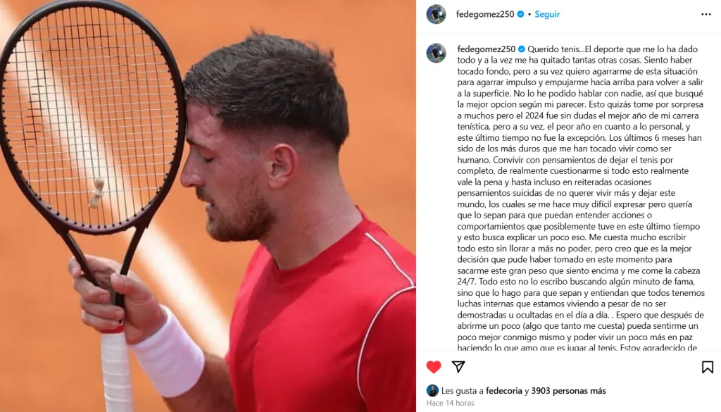En un posteo en su cuenta de Instagram, Fede Gómez -popularmente conocido como el Gordo- se expresó a corazón abierto. Reveló que, si bien 2024 fue su mejor año en cuanto a lo tenístico, en el cual alcanzó su mejor ranking -el puesto 133- la realidad es que por dentro vivió un calvario. No estuvo para nada bien en cuanto a lo anímico e inclusive expresó abiertamente que tuvo pensamientos suicidas.
