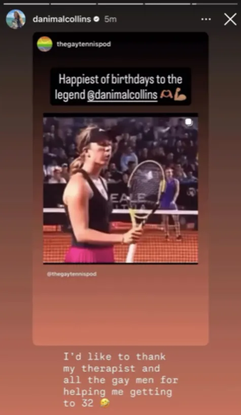 El pasado 13 de diciembre, Danielle Collins cumplió 32 años y utilizó sus redes sociales para agradecer algunos de los mensajes que le dedicaron. El más llamativo de todos fue el que reposteó de la cuenta @thegaytennispod. La estadounidense se mostró agradecida y respondió, en tono amistoso: “Tengo que agradecerle a mi terapeuta y a todos los hombres gays por haber llegado a los 32”, acompañado del emoji de una cara sonriente.