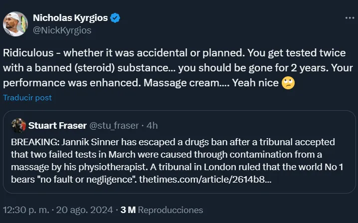 “Es ridículo, ya sea accidental o planeado. Te hacen dos pruebas con una sustancia prohibida (esteroides). Deberías estar fuera durante dos años. Tu rendimiento mejoró. Crema para masajes. Sí, está bien”, compartió Kyrgios a través de las redes sociales.